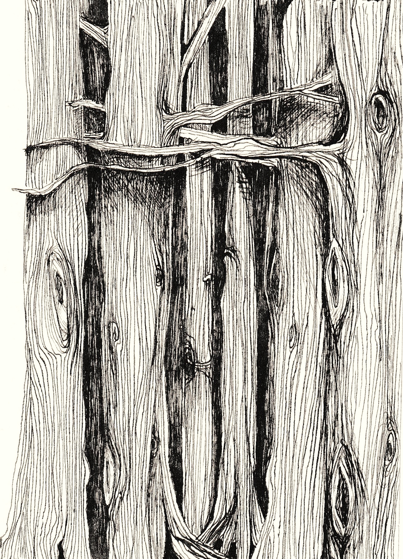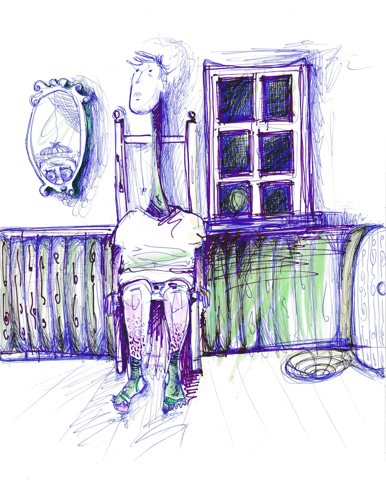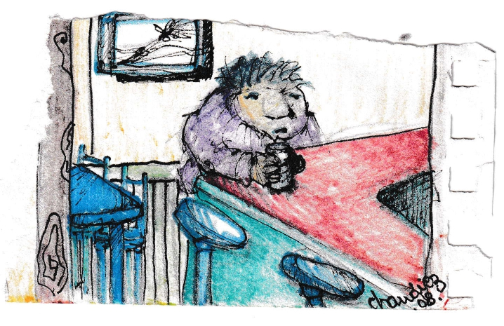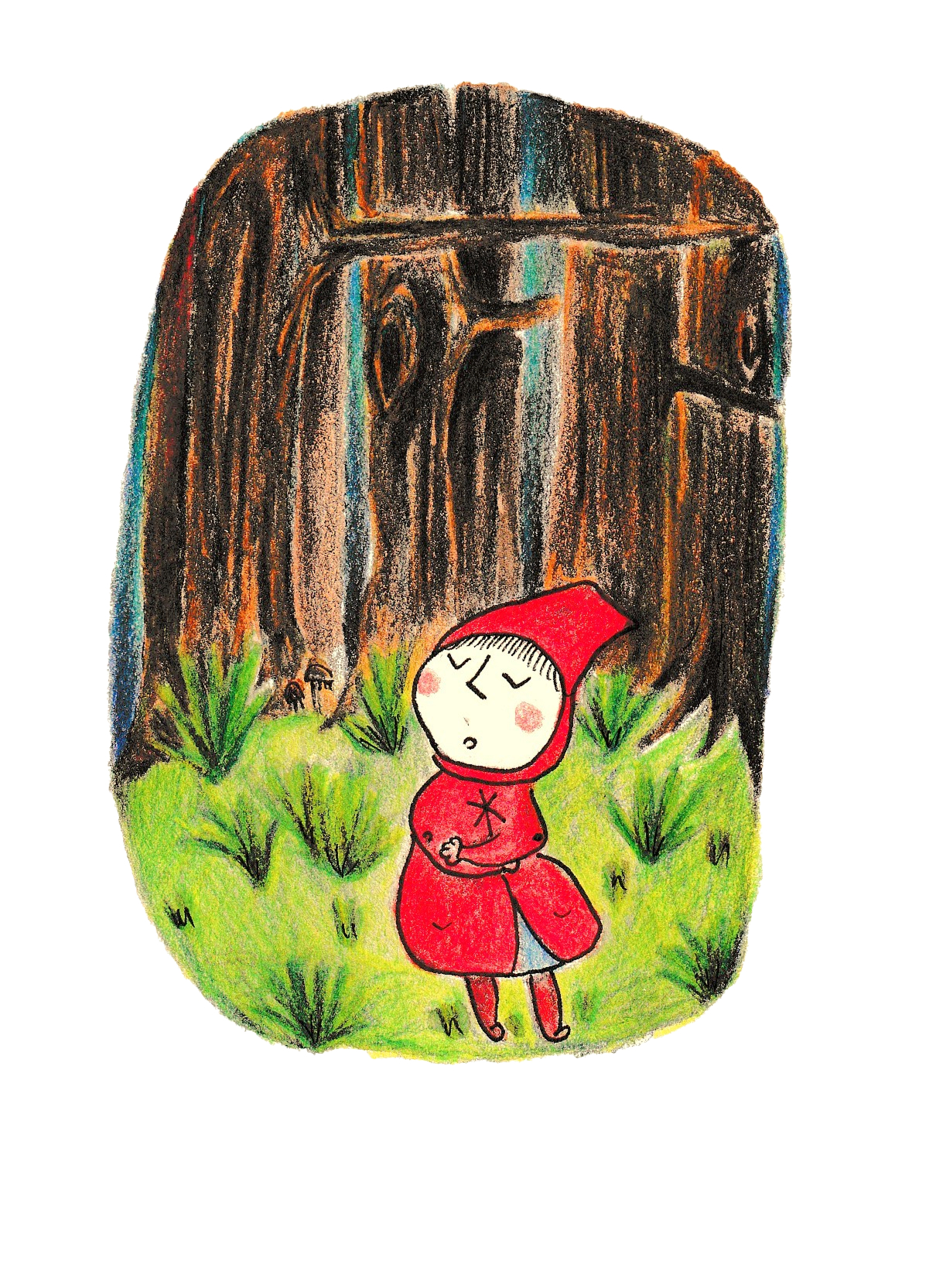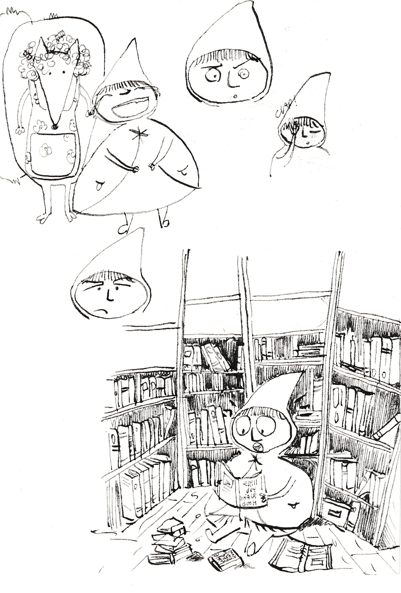 Croquis Chaperon et le Loup, Chaperon rouge à la bibliothèque, plume encre de Chine