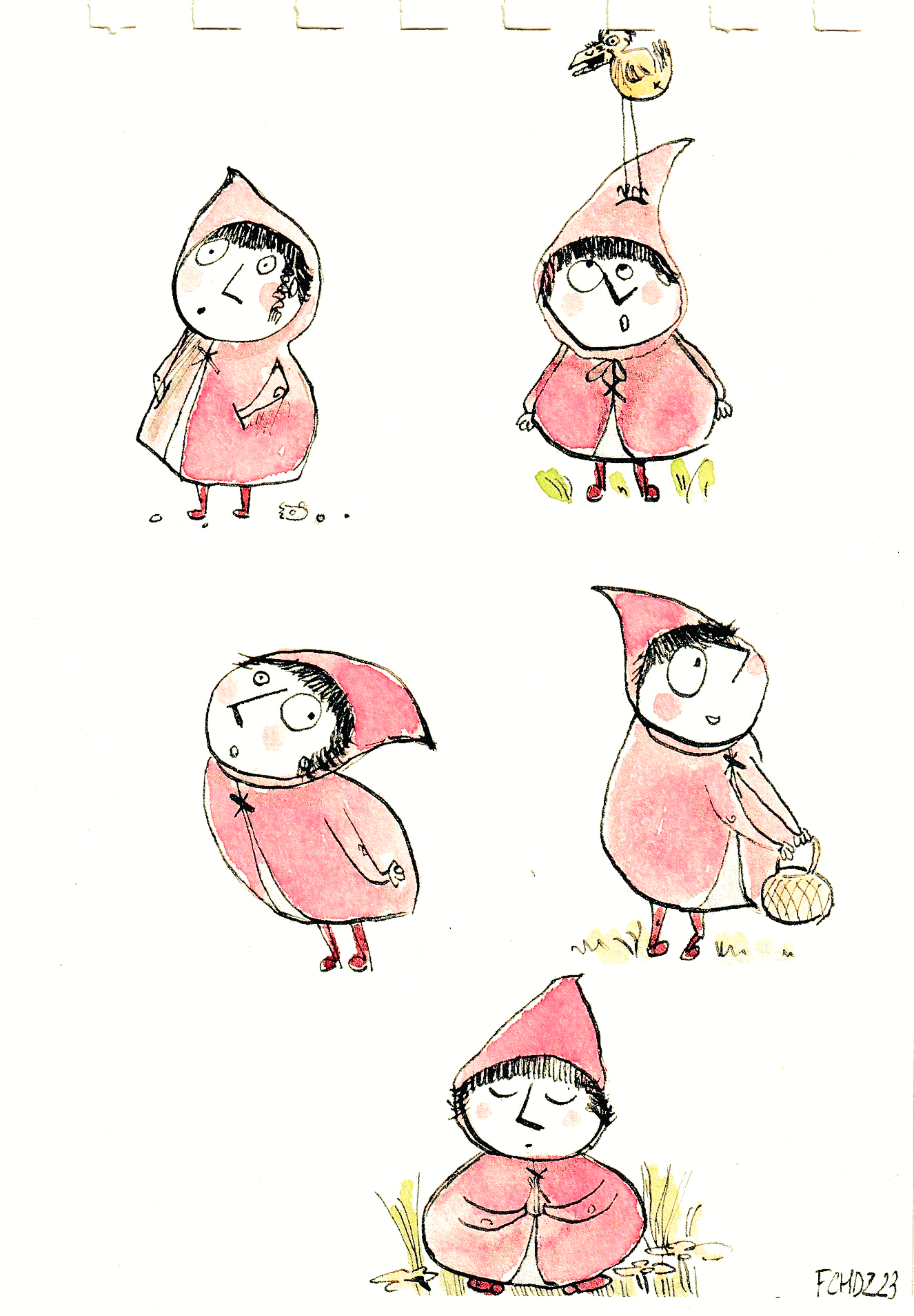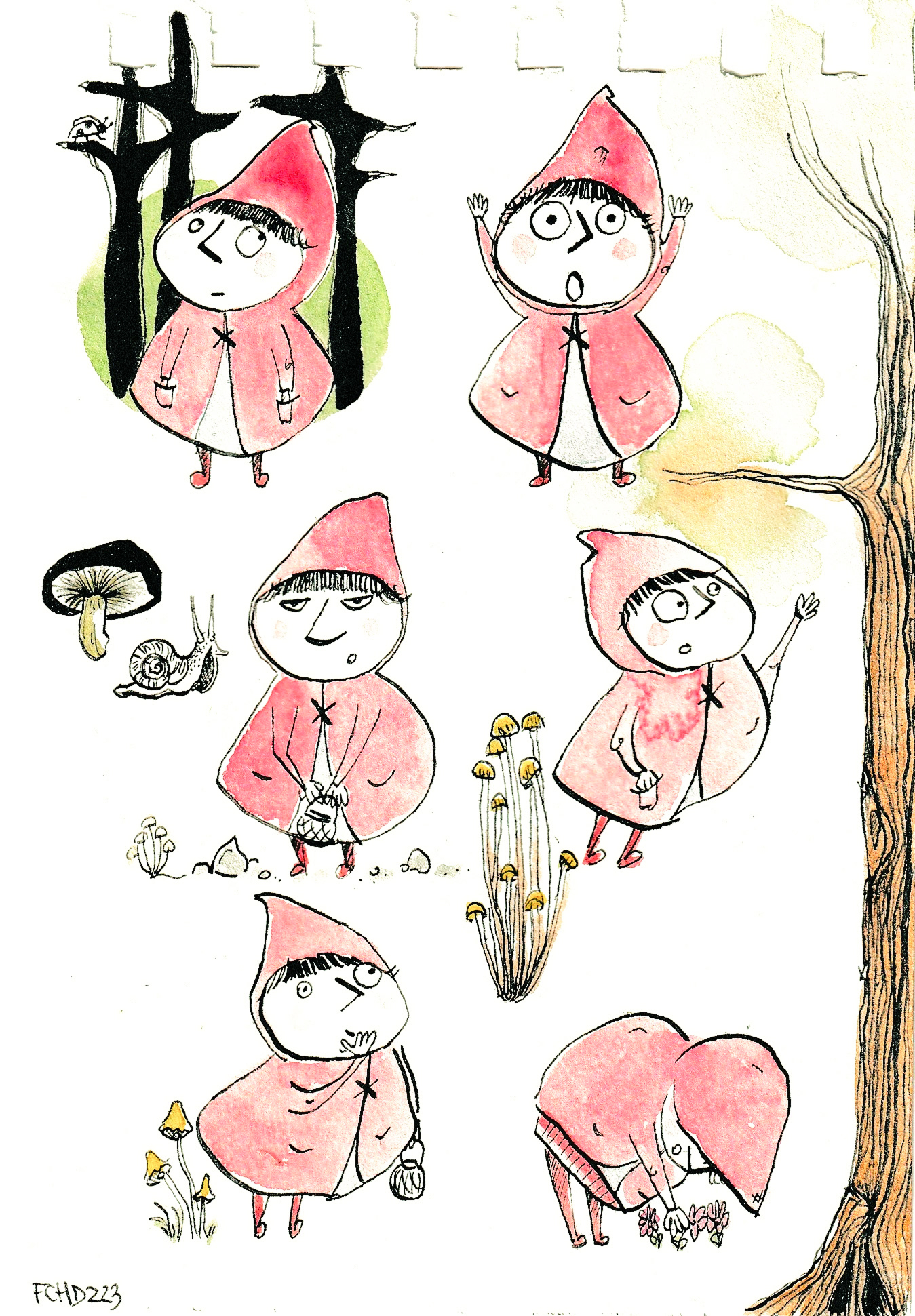 Croquis Chaperon rouge, aquarelle, crayon, plume encre de Chine